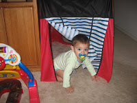 We have decided that Alex needs a toddler bed and NO more sleeping with Mommy and Daddy so we are going to decorate his room in the Disney "Cars" theme. One of our first purchases was this hideaway tent.